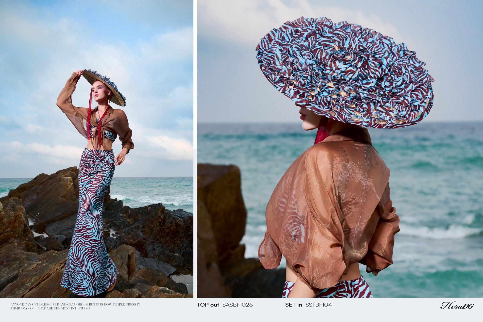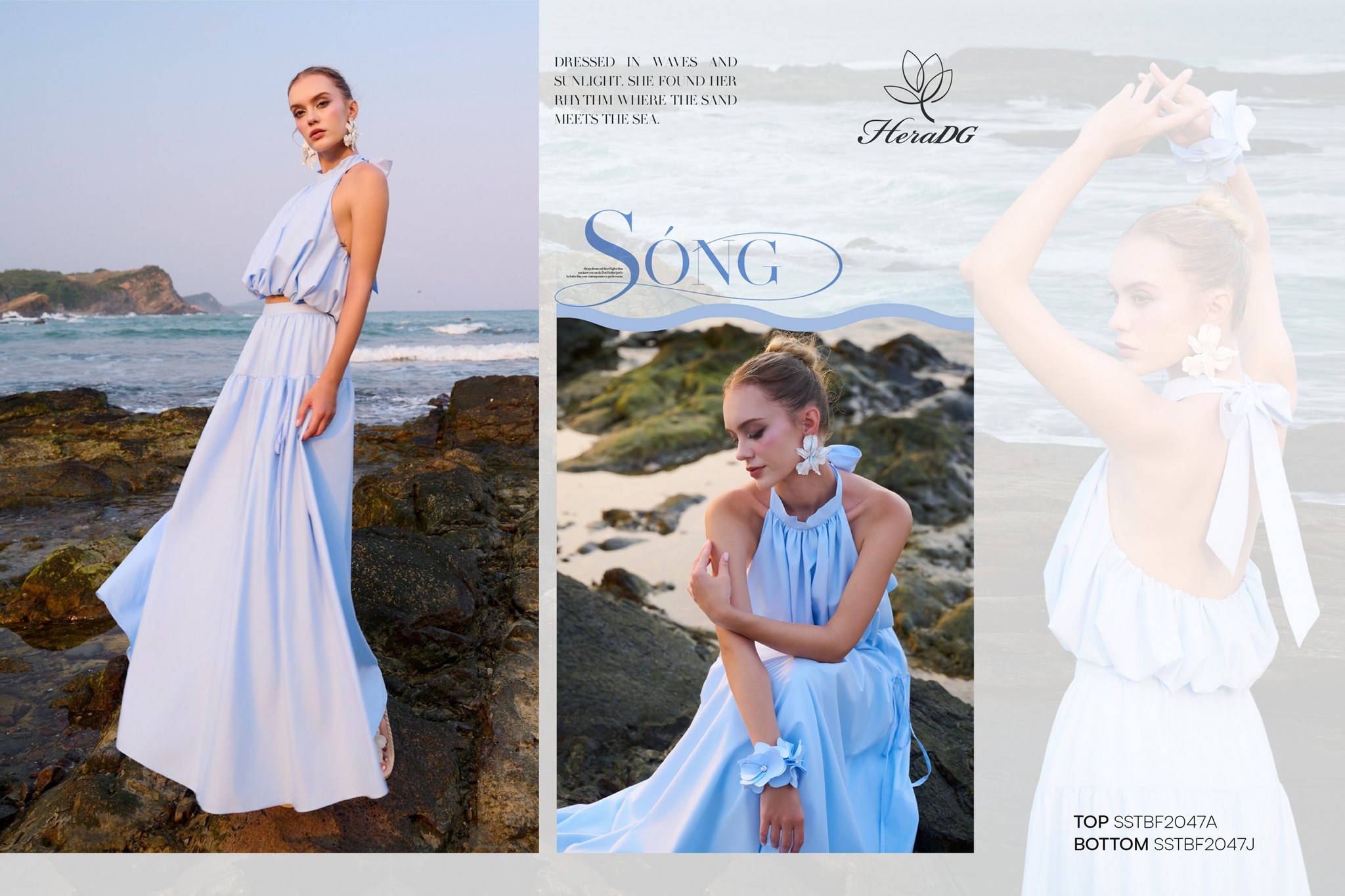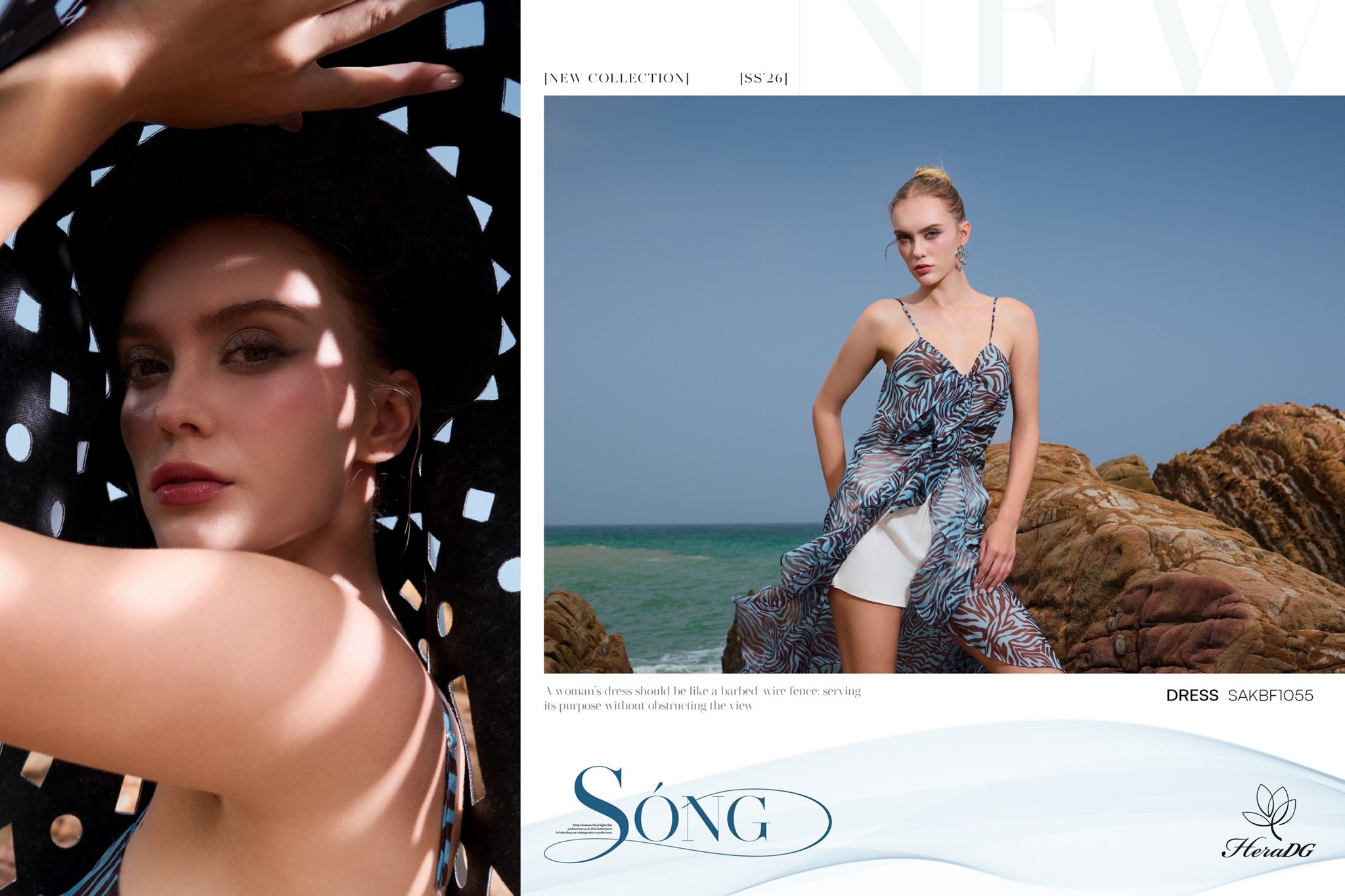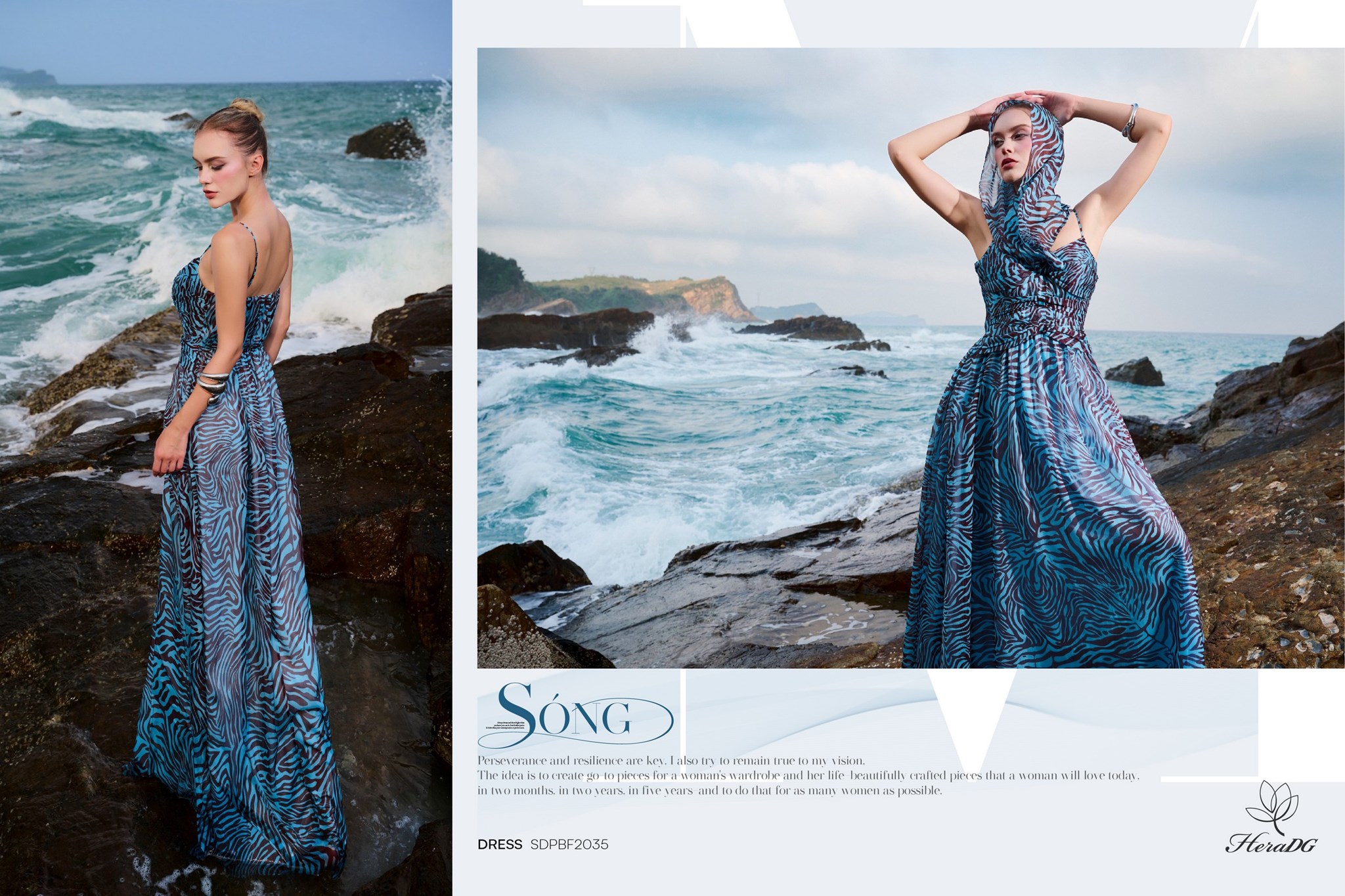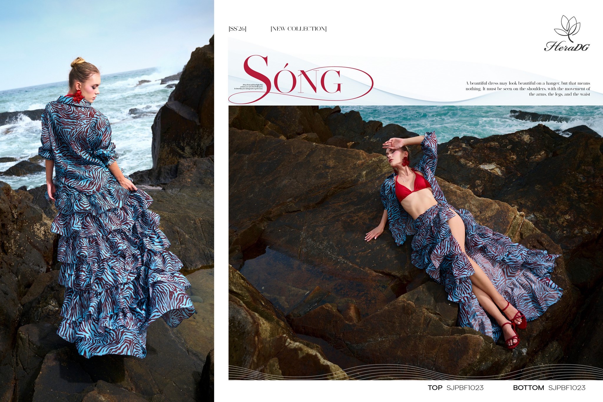 Bộ sưu tập lấy cảm hứng từ sự giao thoa giữa họa tiết thiên nhiên hoang dã và sắc độ bất tận của biển cả, 𝑩𝑺𝑻 "𝑺𝑶́𝑵𝑮" của HeraDG mở ra một làn gió mới phóng khoáng, cảm xúc nhưng vẫn đầy tinh tế và chiều sâu. Những con sóng khẽ vỗ vào triền đá, mang theo hơi thở của biển và những dấu ấn hoang dã từ thiên nhiên. Mặt biển trở thành tấm gương phản chiếu bầu trời hoàng hôn, nơi những họa tiết mang tinh thần tự do dần tan vào làn nước, trở nên mềm mại và đầy cảm xúc. Từ núi đá vững chãi đến làn sóng dạt dào, tất cả hòa quyện trong một nhịp điệu vừa mạnh mẽ, vừa tinh tế – như chính vẻ đẹp của người phụ nữ hiện đại.