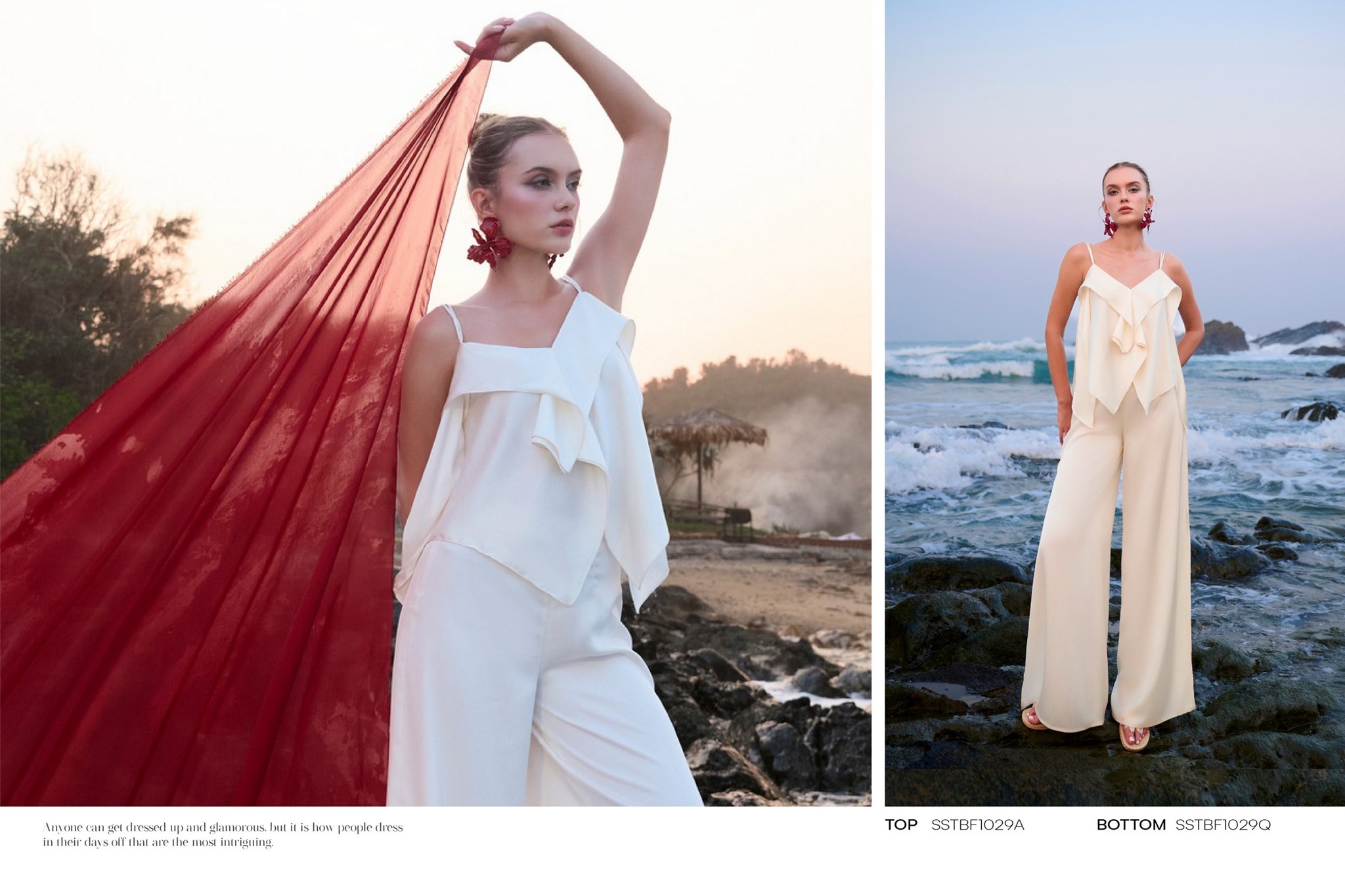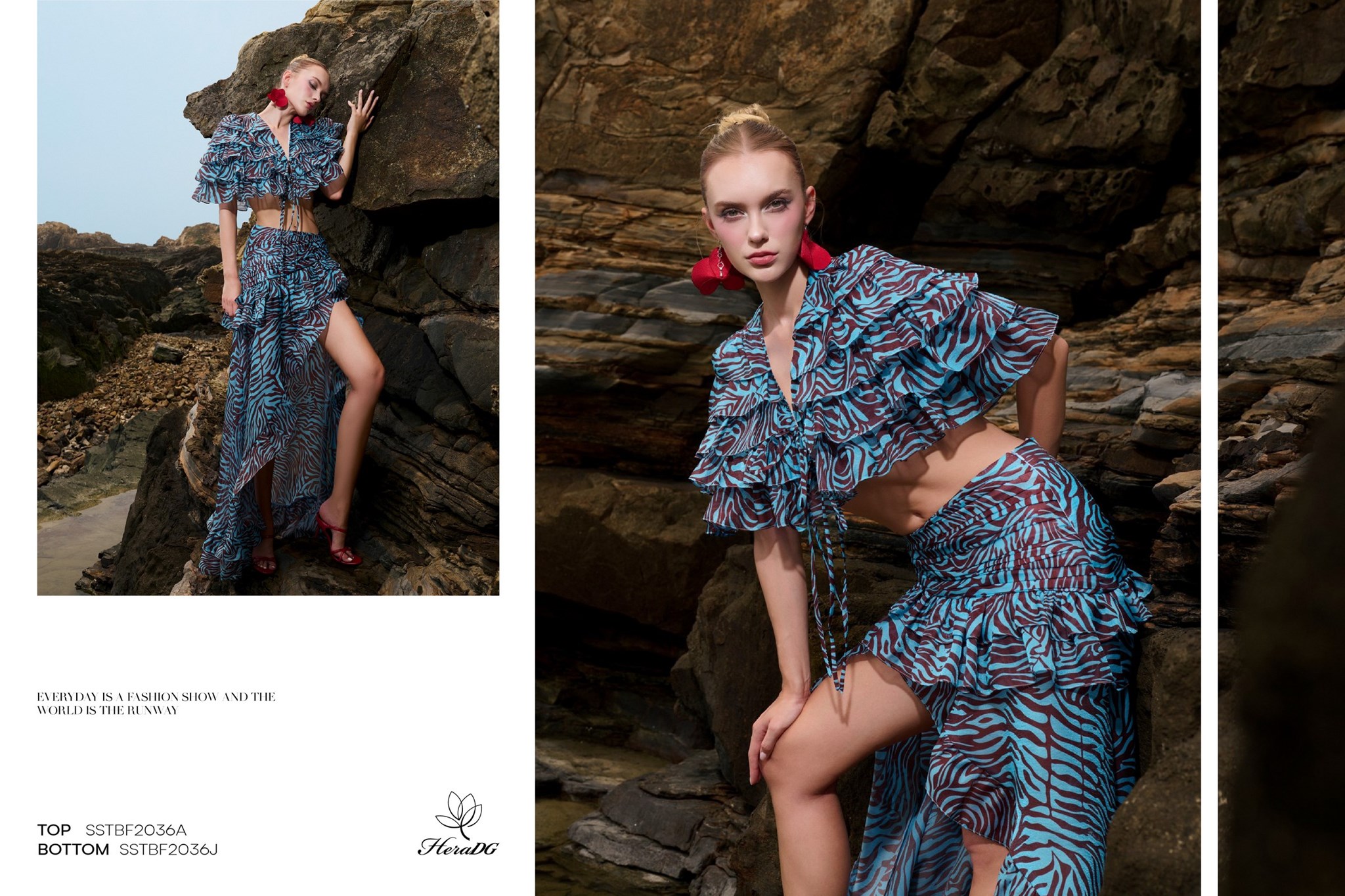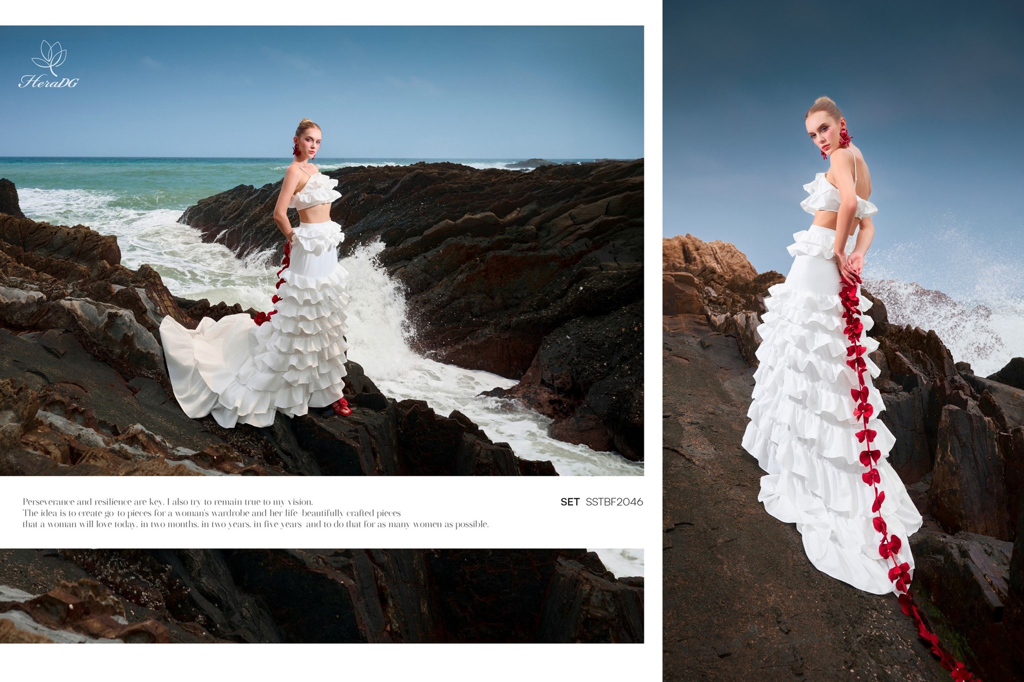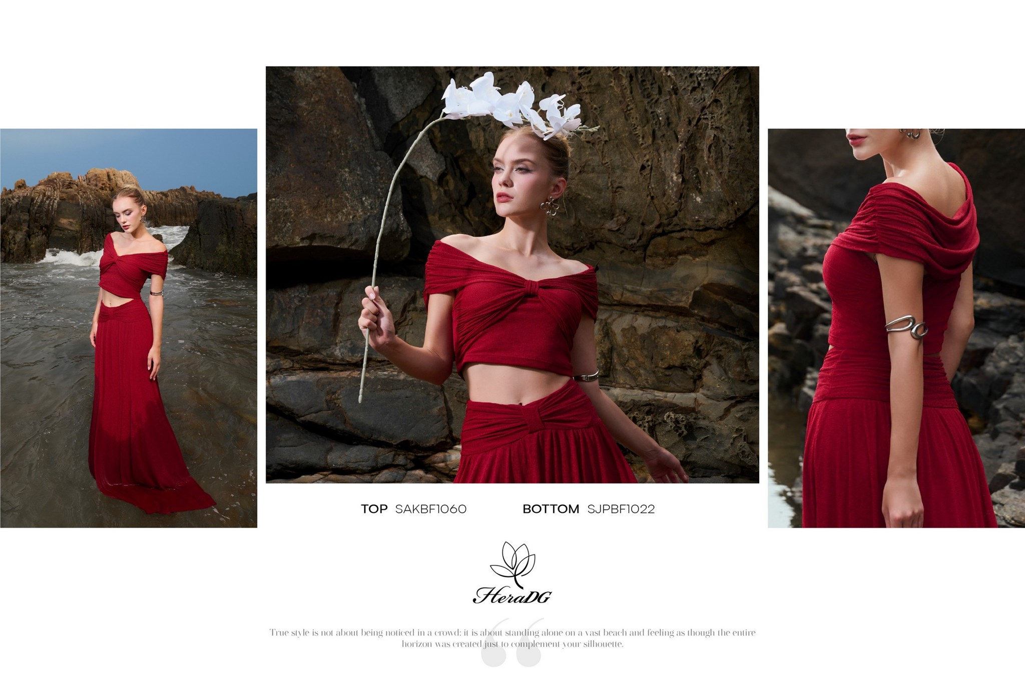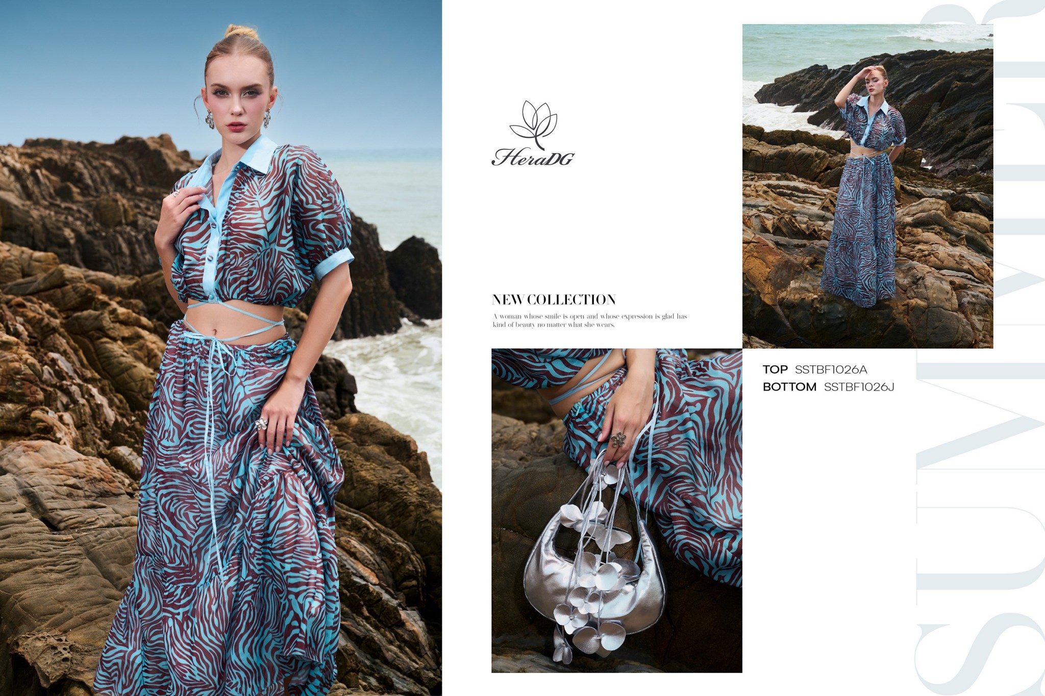 Bộ sưu tập lấy cảm hứng từ sự giao thoa giữa họa tiết thiên nhiên hoang dã và sắc độ bất tận của biển cả, 𝑩𝑺𝑻 "𝑺𝑶́𝑵𝑮" của HeraDG mở ra một làn gió mới phóng khoáng, cảm xúc nhưng vẫn đầy tinh tế và chiều sâu. Những con sóng khẽ vỗ vào triền đá, mang theo hơi thở của biển và những dấu ấn hoang dã từ thiên nhiên. Mặt biển trở thành tấm gương phản chiếu bầu trời hoàng hôn, nơi những họa tiết mang tinh thần tự do dần tan vào làn nước, trở nên mềm mại và đầy cảm xúc. Từ núi đá vững chãi đến làn sóng dạt dào, tất cả hòa quyện trong một nhịp điệu vừa mạnh mẽ, vừa tinh tế – như chính vẻ đẹp của người phụ nữ hiện đại.
